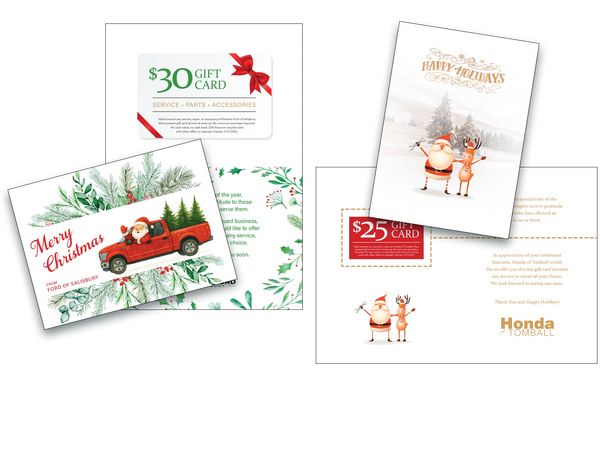 Our Holiday Cards are delivered in a custom printed envelope with hand-written address and postage stamp to convey the spirit of the holidays and show your customers appreciation for the year. Enjoy fast turn-around with custom artwork and messaging. We can even attach a customized plastic gift card to the inside of your greeting card promotion.